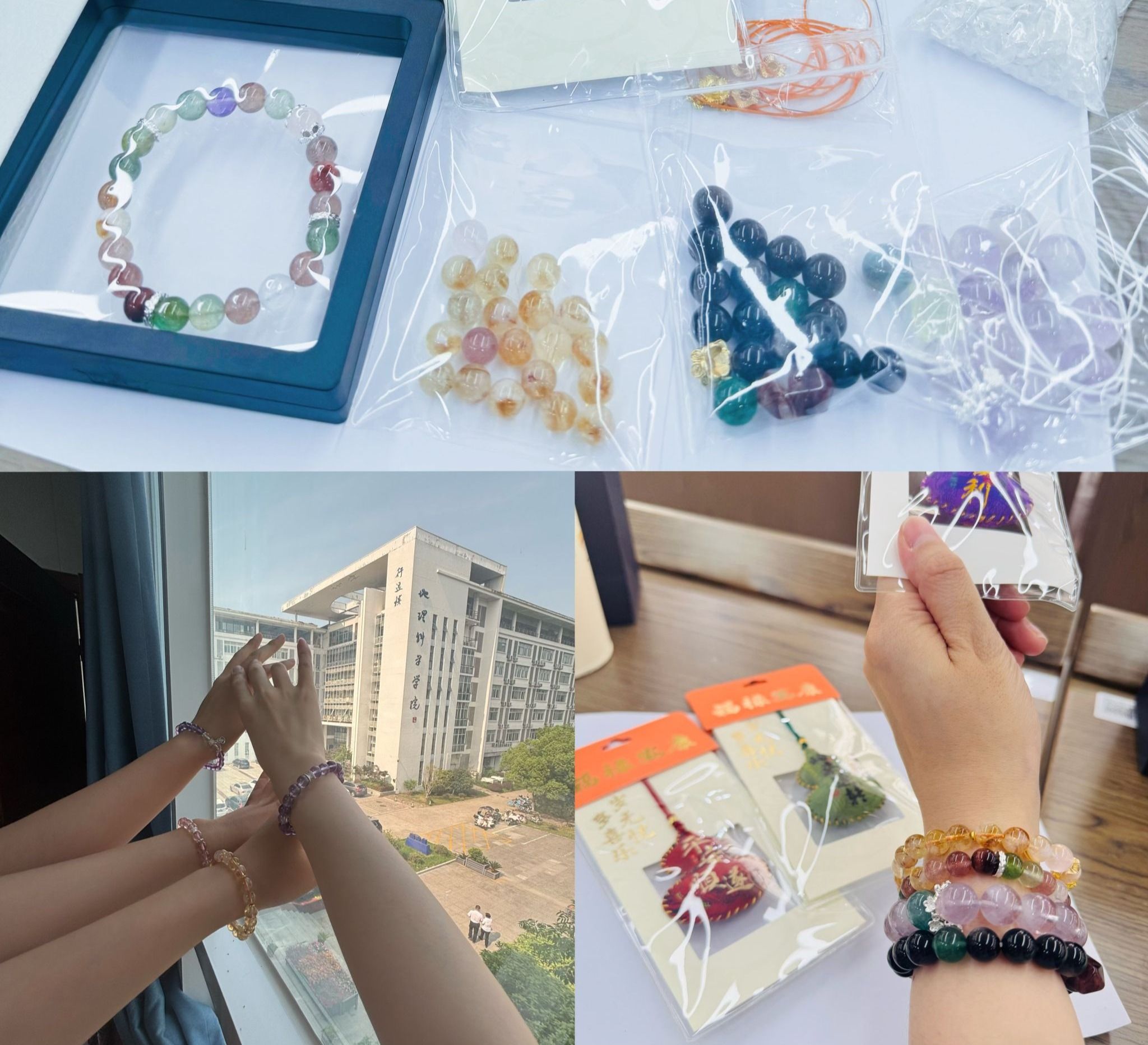 活动特邀相关专业老师为大家讲解水晶知识。老师不仅生动有趣地讲解了水晶的定义、分类和色彩搭配美学,还细致具体地介绍了串珠所需准备的材料,包括不同颜色和尺寸的珠子、绳子、鱼线、备用配件和剪刀等。理论讲解结束后,老师一个步骤接一个步骤耐心地向大家展示着串珠过程与实操技巧。