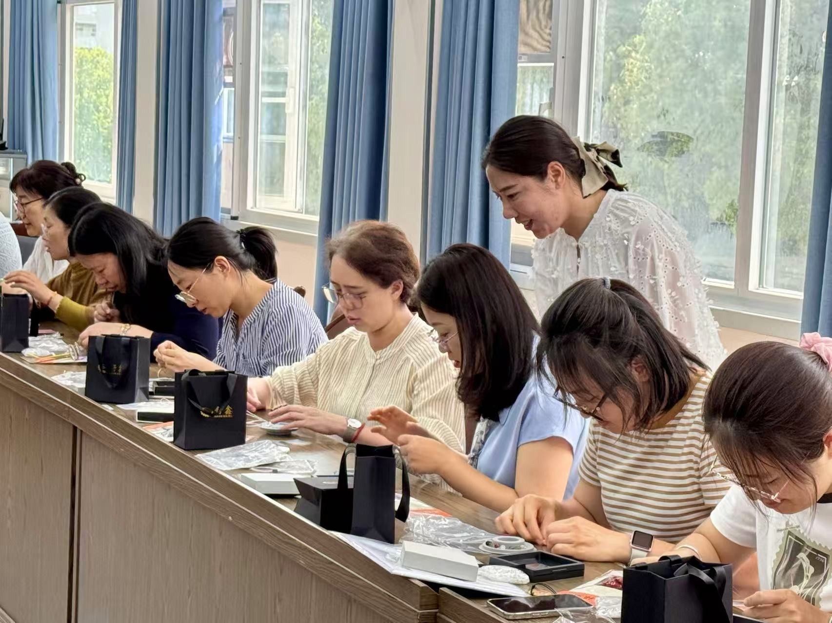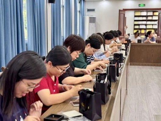 在DIY体验环节,女教师们纷纷挑选各式各样的水晶珠子,并用鱼线作为穿针把绳子穿过一个又一个珠子的小孔,大家充分发挥创造力,亲手制作着属于自己的水晶串珠作品。活动现场气氛热烈,欢声笑语不断,女教师们相互展示自己手中的串珠,在轻松愉悦的氛围中感受到了节日的喜悦与手工艺术的魅力。
